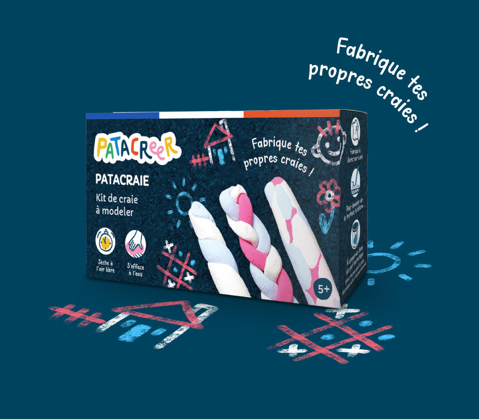Patacraie est une pâte à modeler qui, une fois durcie à l’air libre, devient ...une CRAIE! Sur le bitume, les murs ou les tableaux, elle permettra l’expressivité des petits comme des grands et ceci sans contrainte puisque les «œuvres» s’effaceront à l’eau!